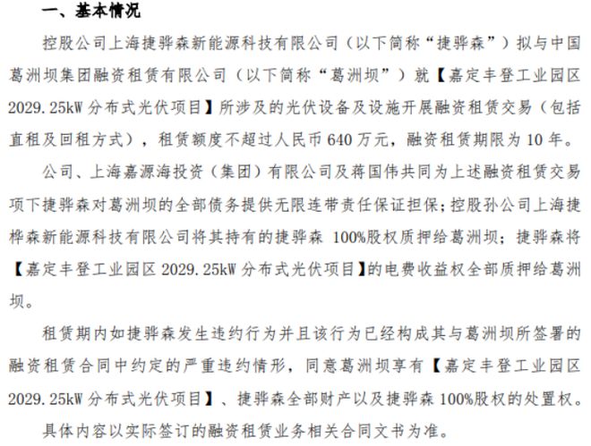 公司、上海嘉源海投资(集团)有限公司及蒋国伟共同为上述融资租赁交易项下捷骅森对葛洲坝的全部债务提供无限连带责任保证担保;控股孙公司上海捷桦森新能源科技有限公司将其持有的捷骅森100%股权质押给葛洲坝;捷骅森将【嘉定丰登工业园区2029.25kW分布式光伏项目】的电费收益权全部质押给葛洲坝。