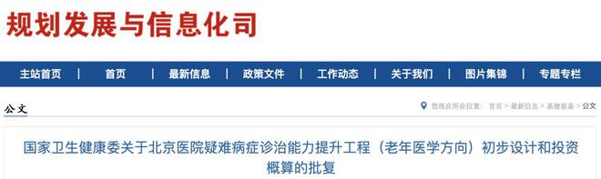 凯发k8游戏官网入口近日,据国家卫健委规划发展与信息化司消息,对北京医院疑难病症诊治能力提升工程(老年医学方向)初步设计和投资概算的批复。概算总投资19785万元,用于购置老年医学相关诊疗及科研设备、开展信息化和科研平台建设等。
