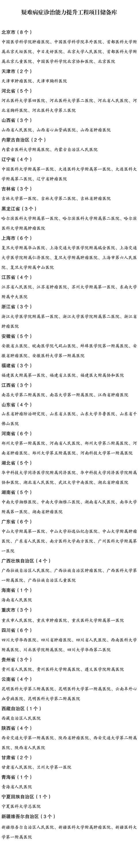 此前国家发改委、卫健委再次联合发布《关于印发疑难病症诊治能力提升工程项目储备库的通知》,公布了最终遴选出来的113所省部级医院名单。其中,北京市有8家医院入选,四川、广东、河南、上海也均有6家。(文末附名单)